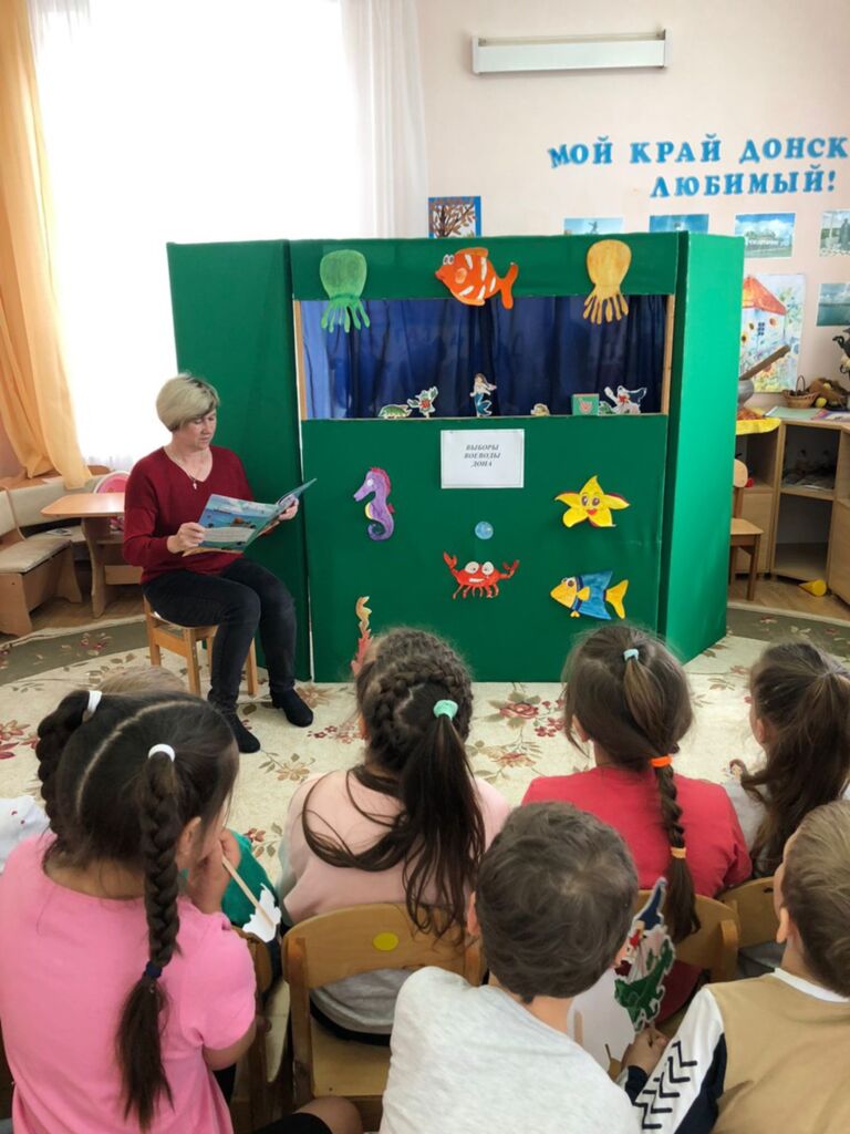 Музыкальный зал МБДОУ был оформлен в виде избирательного участка, групповые комнаты - в виде подводного царства. В процессе игры воспитанники получили элементарные представления о выборах в органы государственной власти. Они побывали в роли избирателей, наблюдателей, членов избирательной комиссии. Учились голосовать, правильно вести себя на избирательном участке.