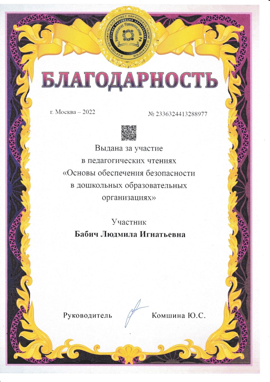 Благодарность Бабич Л.И. за участие в педагогических чтениях "Основы обеспечения безопасности в дошкольных образовательных организациях" |