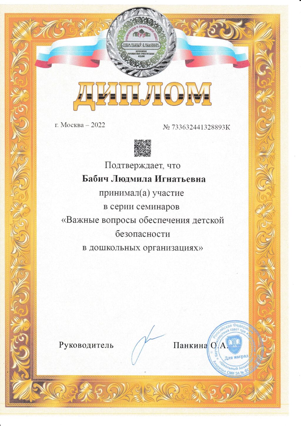 Диплом Бабич Л.И. об участии в серии семинаров "Важные вопросы обеспечения детской безопасности в дошкольных организациях" |