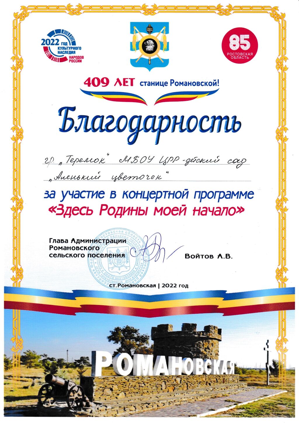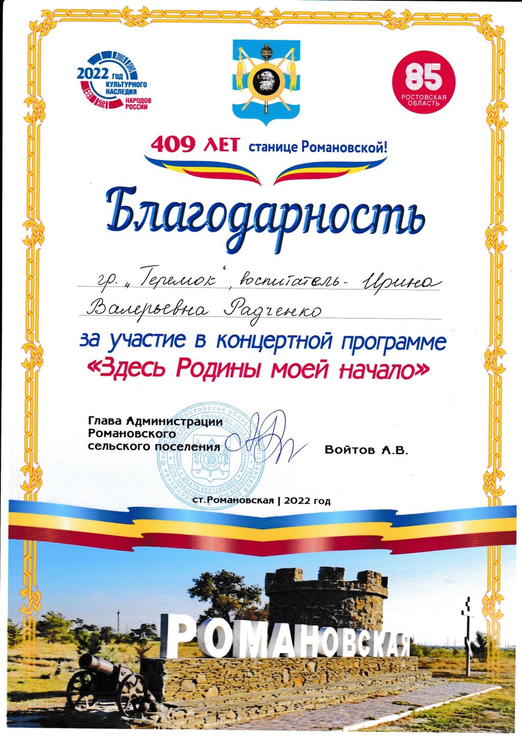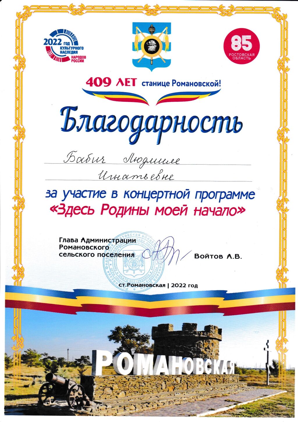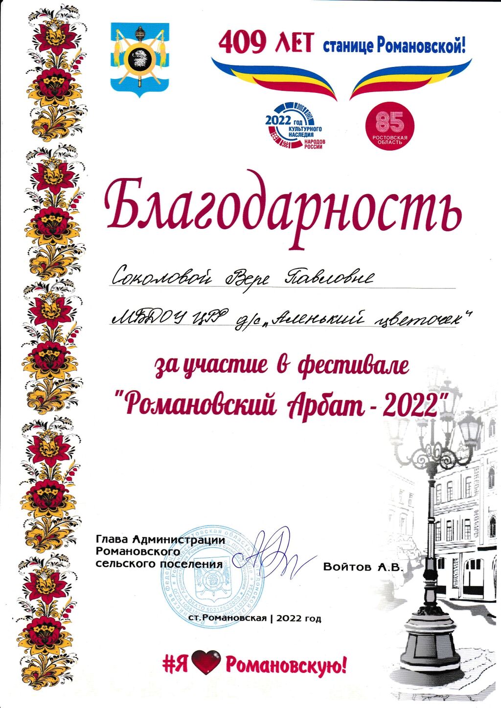 Благодарность Соколовой В.П. за участие в фестивале "Романовский арбат - 2022" |