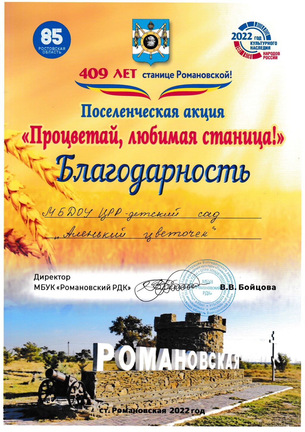 Благодарность МБДОУ ЦРР - детскому саду "Аленький цветочек" за участие в поселенческой акции "Процветай, любимая станица" |