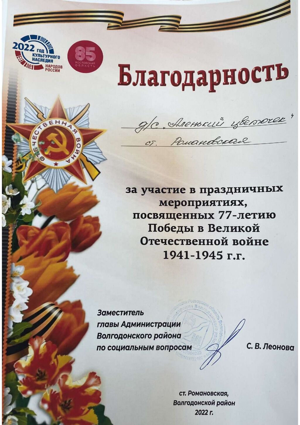 Благодарность за участие в праздничных мероприятиях, посвященных 77 - летию Победы в Великой Отечественной войне |